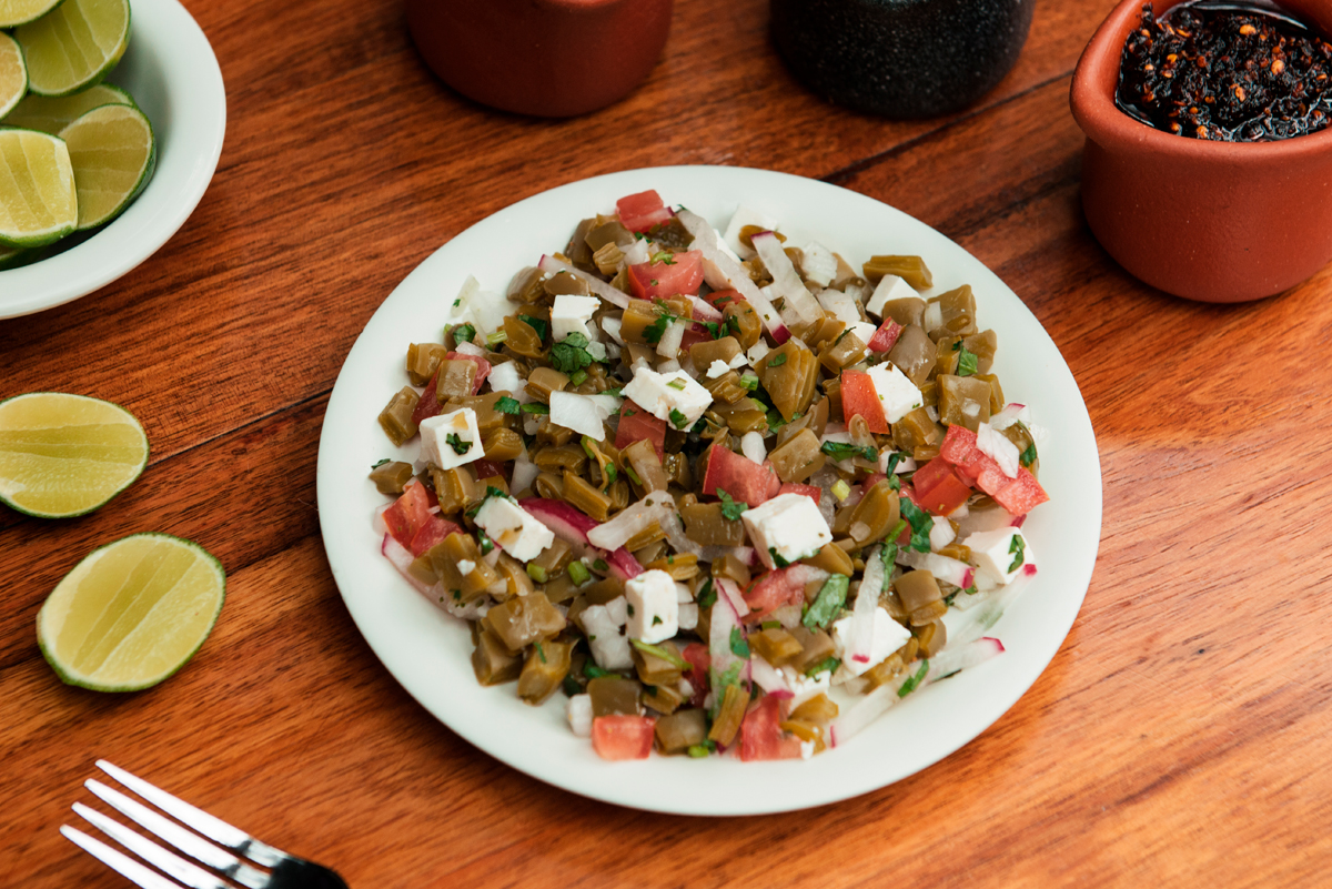 Con guarnición de tres nopales cambray asados y guacamole.