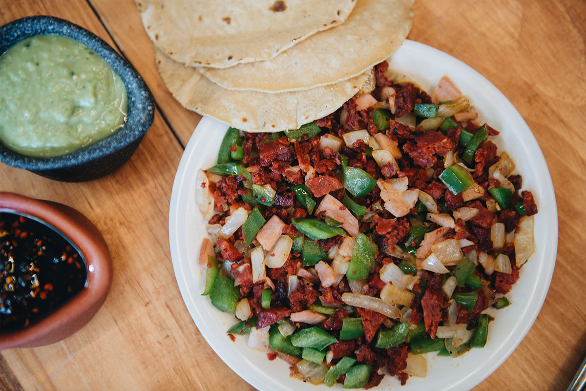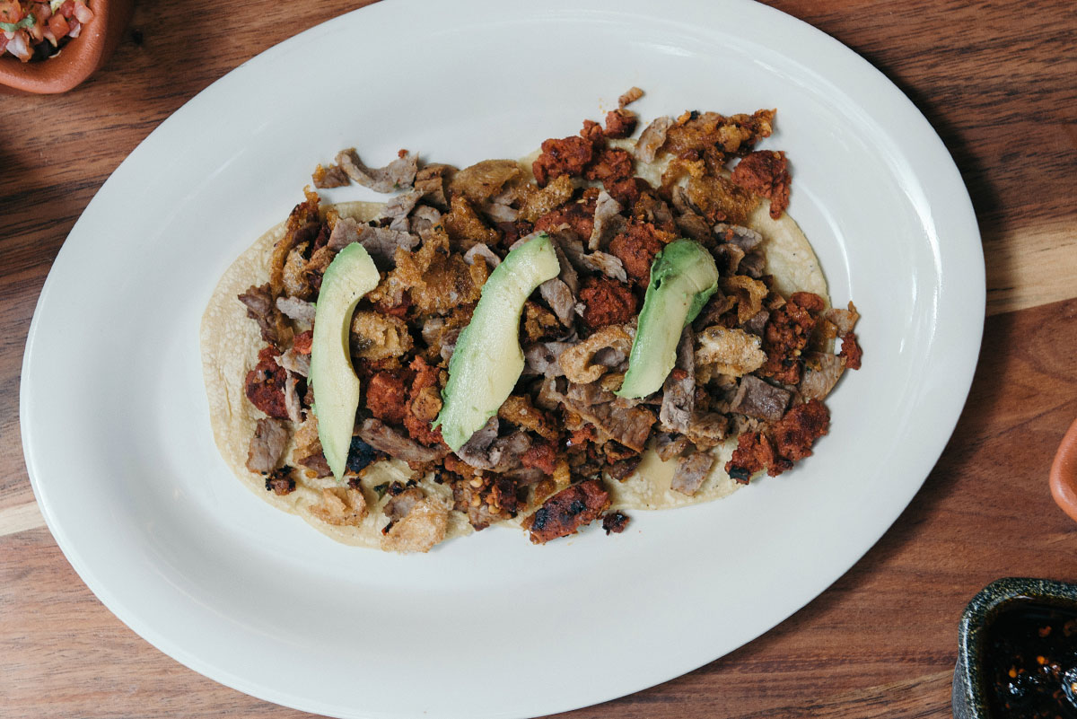 Orden de tres. Bistec, chorizo y chicharrón seco, bañados con salsa roja y rebanadas de aguacate.