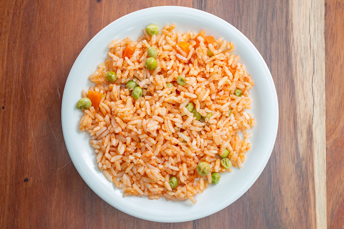Pechuga de pollo deshebrada, arroz a la mexicana, rábano, cilantro y aguacate.