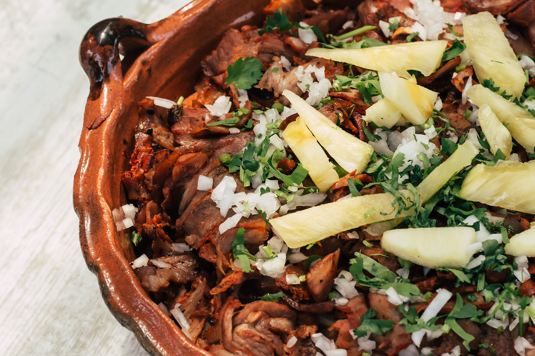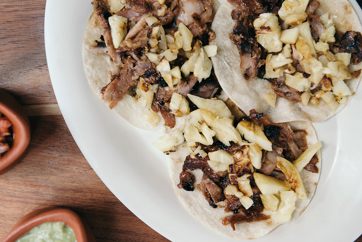 Orden de tres. Carne de cerdo a la BBQ cocinada en el trompo, sobre tortilla de harina y con piña asada.