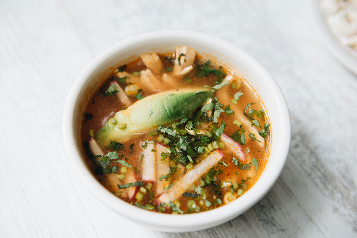 Caldo de jitomate con juliana de tortilla frita, queso gouda, chile pasilla dorado, chicharrón seco y aguacate.
