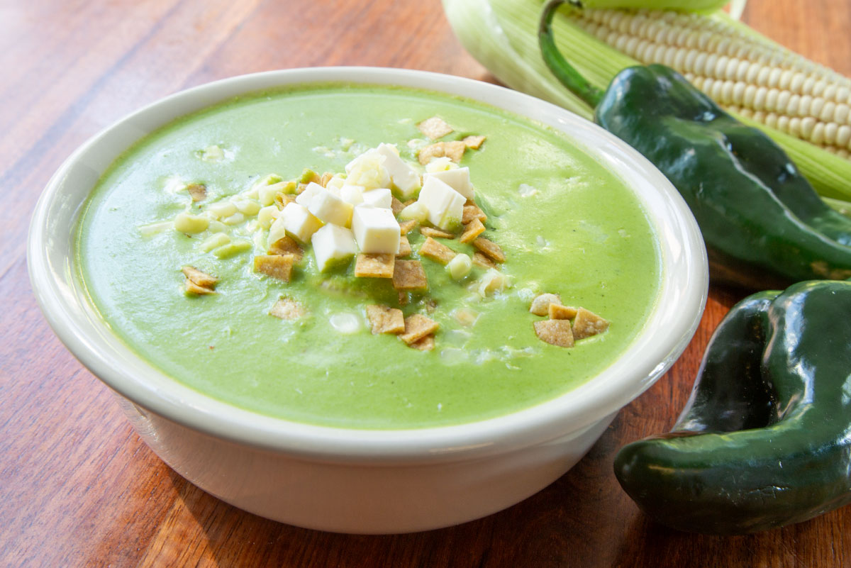 Preparada con chile poblano, acompañada de granos de elote, cuadritos de queso panela y trocitos de tortilla frita.