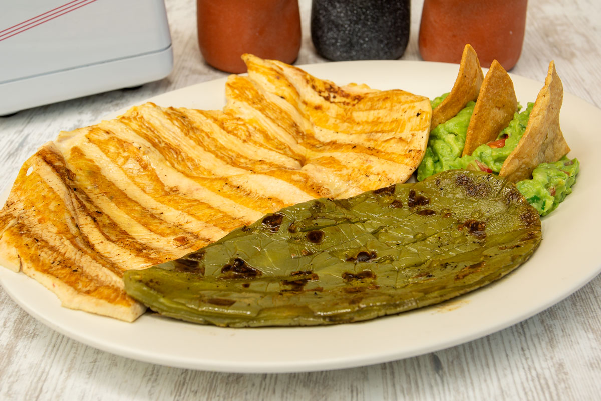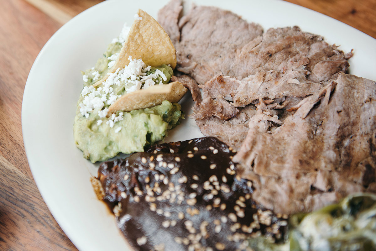Con guarnición de rajas con crema, dos dobladitas de mole.
