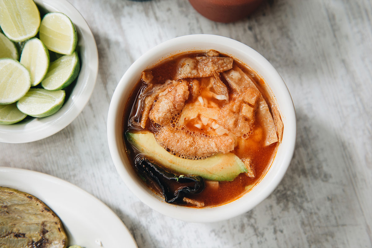 Caldo de jitomate con juliana de tortilla frita, queso gouda, chile pasilla dorado, chicharrón seco y aguacate.