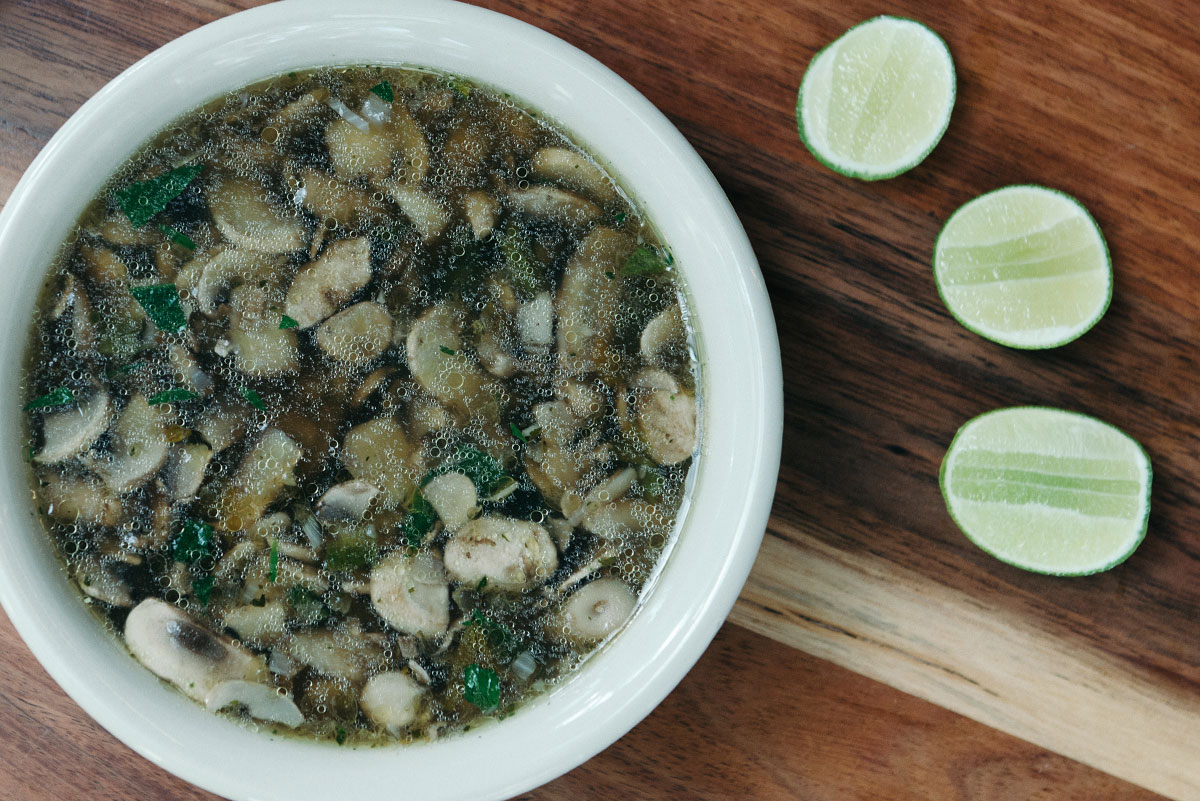 Hongos frescos, granos de elote, rajas de chile poblano, espinacas o flor de calabaza (según la temporada) y chile morita.