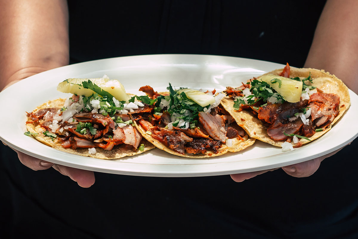Orden de tres. Carne de cerdo a la BBQ cocinada en el trompo, sobre tortilla de harina y con piña asada.
